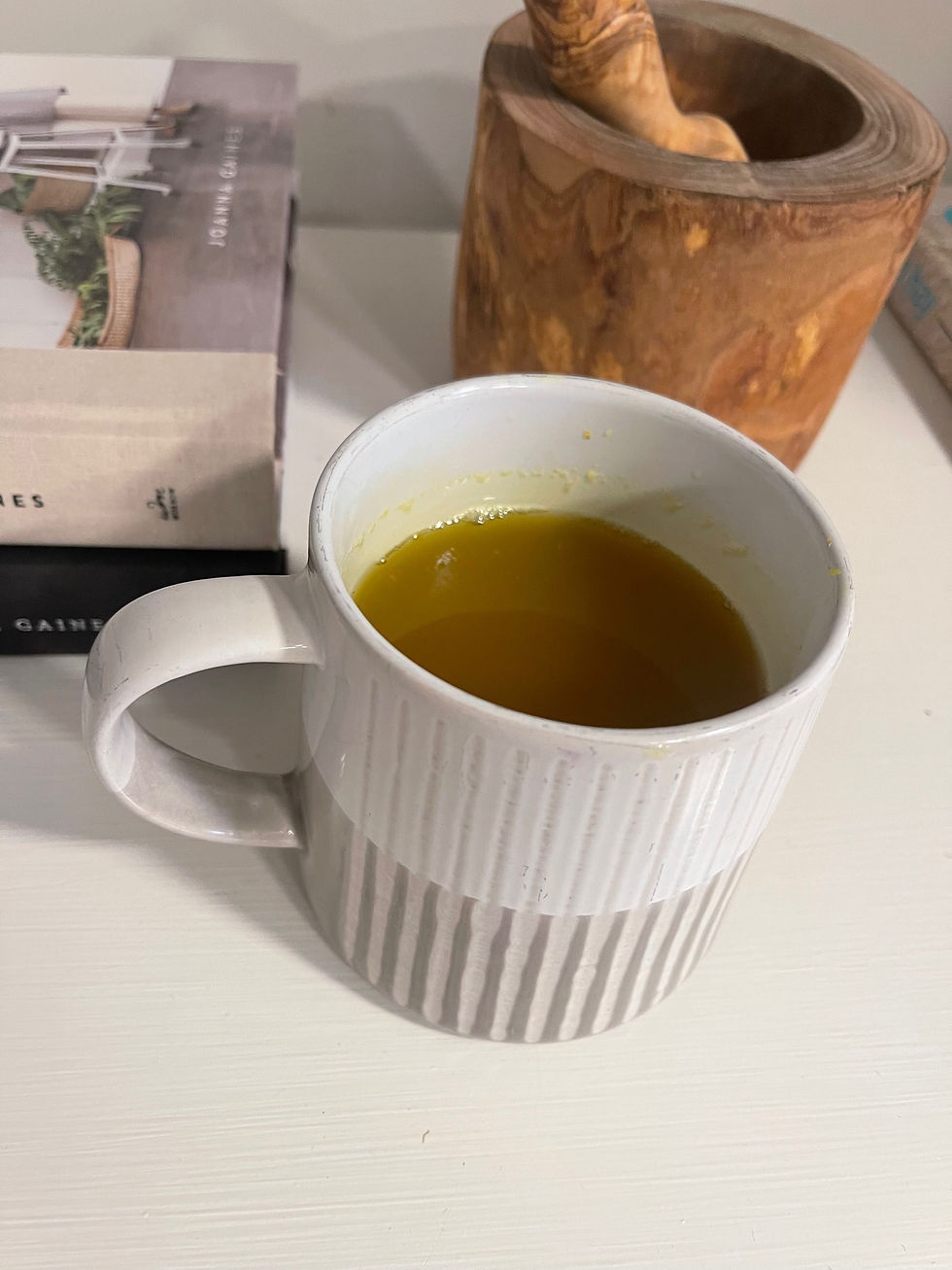 Strain the ginger water into a cup or mug to remove the ginger pieces. I left mine in.